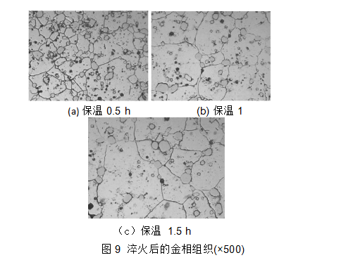 (2)熱處理。正確的熱處理工藝,對于提高粉末高速鋼的性能是非常必要的,T15 粉末高速鋼的淬火溫度大概為1 230~1 260 ℃,我們選擇了 1 240 ℃,希望通過延長淬火保溫時間來溶解大尺寸的碳化物。我們?nèi)×酥睆綖?10 mm 的小樣,分別保溫 0.5 h、1 h 和 1.5 h 作為對比,圖 9 為淬火后的組織圖。由圖 9(a)可以看到,保溫 0.5 h 晶粒未長大,但是碳化物尺寸并沒有減??;由圖 9(b) 可以看到,保溫 1 h 后晶粒明顯長大,但是碳化物尺寸沒有改變;而圖 9(c) 保溫 1.5 h 后,晶粒明顯長大,并且伴隨著少量的晶界熔化,而碳化物尺寸仍然沒有減小的趨勢。由此我們可以知道,延長熱處理保溫時間對減小碳化物的尺寸,也是沒有效果的。由于大尺寸的碳化物主要分布在顆粒邊界處,顆粒邊界由于氧化物等雜質(zhì)元素富集,這些都增加了碳化物溶解的阻力。