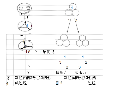 [3]。其主要過程是液相與固相共存區(qū),降低溫度冷卻時,液相首先轉(zhuǎn)變?yōu)閵W氏體相(即 L → γ),隨后溫度繼續(xù)降低,在奧氏體相之間剩余的液相發(fā)生共晶轉(zhuǎn)變,轉(zhuǎn)變?yōu)閵W氏體和碳化物(即 Le → γ + 碳化物),直到最終全部轉(zhuǎn)變?yōu)楣滔酁橹梗祟愄蓟镌陬w粒內(nèi)部,抑制了碳化物的長大。對于第二類碳化物,結(jié)合熱等靜壓的原理以及碳化物析出的形貌分析,本文提出了碳化物析出-聚集長大的碳化物粗化模型(如圖 5 所示),在高壓條件下,顆粒間比較致密,顆粒間形成的碳化物比較細??;在低壓條件下,顆粒間比較疏松,顆粒間形成的碳化物就比較粗大。
