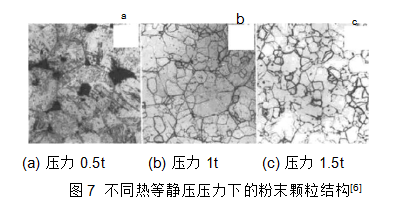- 7 為吳引江等人研究的在不同壓力下,在 900 ℃ 保溫3 h 熱等靜壓機中,Ti- 5Al- 2.5Sn 粉末顆粒界面的形態(tài),圖 7(a)中顆粒形狀基本沒有太大變化,仍為初始的圓形,并且顆粒之間有很大的間隙,當壓力增大時,顆粒變形較大,顆粒間的空隙消失,這也證實了我們的模型圖。