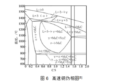 為了進一步解釋本文提出的碳化物析出-聚集長大的碳化物粗化的模型,從熱力學和動力學方面進行了分析。圖 6 為高速鋼偽相圖,T15 粉末高速鋼含碳量為 1.5% ~ 1.6%,在1 100~1 150 ℃的熱等靜壓溫度下,組織中存在液相、碳化物和奧氏體化區(qū)域,也就是說在保溫加壓階段,碳化物已經(jīng)開始析出。因為顆粒大多數(shù)為球形,所以當壓力過低時,在顆粒與顆粒之間會存在較大的空隙,由于顆粒邊界能量較高,碳化物優(yōu)先在顆粒邊界析出,這時候顆粒邊界析出的碳化物,會輕而易舉的占據(jù)這個空隙,與相近的碳化物接觸,從而聚集長大,形成了粗大的碳化物。這時候的熱等靜壓壓坯的致密,其實是偽致密,甚至有時候會出現(xiàn)所測密度大于理論密度的現(xiàn)象。而當壓力提高時,顆粒受到較大壓力的作用,形狀發(fā)生改變,朝著有利于顆粒之間空隙減小的方向發(fā)展,結(jié)果就是顆粒之間的空隙大大減小甚至消失。這時候在顆粒間隙上形成的碳化物尺寸,也就相應大大的縮小,碳化物會細小均勻地彌散在顆粒中,這和圖 2 所示的實驗結(jié)果是一致的。