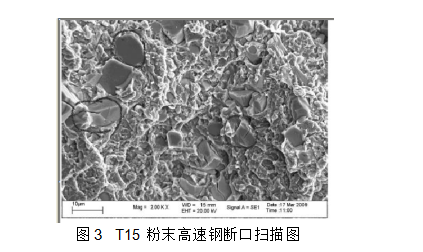 所選熱等靜壓壓力為 65 MPa,溫度為 1 150 ℃,保溫 3 h,壓坯組織圖如 2(a)所示,得到了粗大碳化物,最大尺寸可達15~20 μm,并且粗大的碳化物大多數(shù)都在三個顆粒的邊界交叉處聚集長大,經(jīng)過熱處理后,硬度最高只能達到 65 HRC,抗彎強度最高只有 2 000 MPa 左右,還不及熔煉高速鋼的水平。斷口組織如圖 3 所示,可看到斷裂基本上是沿著大尺寸碳化物組織發(fā)生。碳化物主要是碳化鎢和碳化釩,析出的大尺寸碳化物是性能較低的主要因素。在 65 MPa 的壓力下,把熱等靜壓溫度降低了 50 ℃,壓坯組織圖如 2(b)所示,碳化物尺寸沒有減小,與圖 2(a) 組織圖沒有多大差別,因此我們排除了溫度這個影響因素。并且粉末中的碳化物也是細小彌散分布的,可知大尺寸的碳化物形成主要是我們采用了低壓,一般壓力應該在 100 MPa 以上