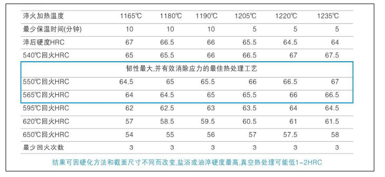 ●淬火 :鹽,油或者空氣中淬至低于595°С以下。均勻后空冷到室溫, 真空或控制氣氛淬火, 硬度稍低, 適合大尺寸工件。1010°С至705°С區間的冷卻速度是關鍵。低于540°С后慢冷變形最小。
